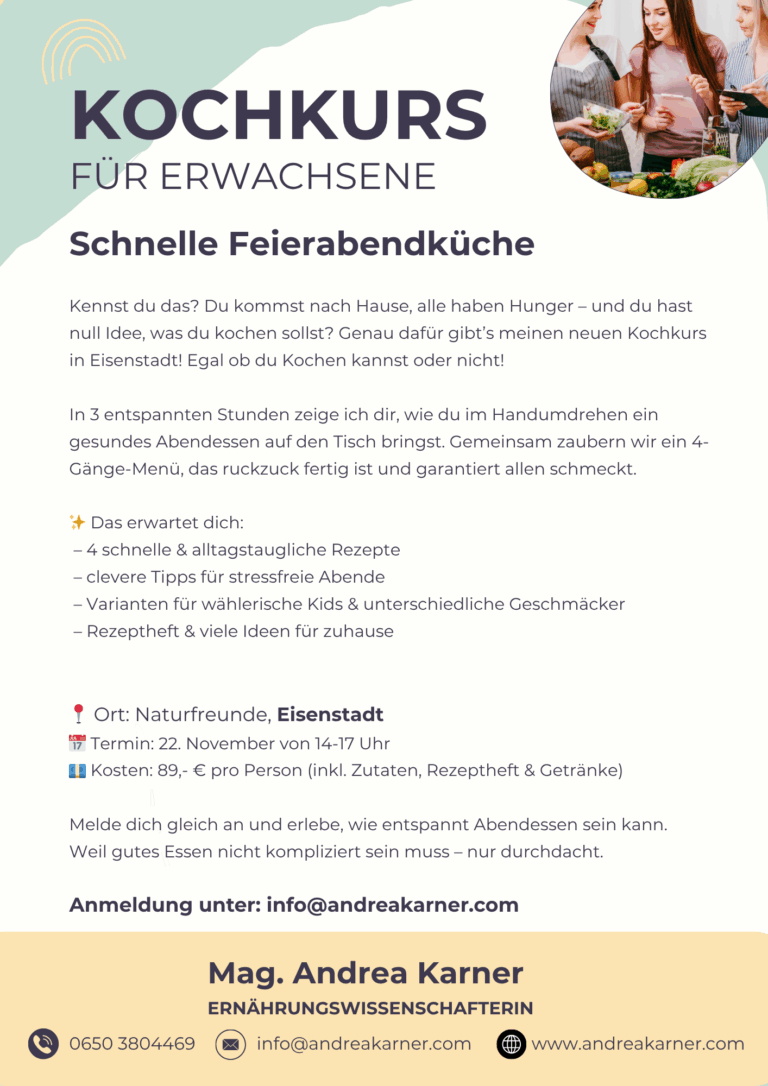 In meinem Kochworkshop „Schnelle Feierabendküche“ zeige ich dir einfache, gesunde Gerichte, die in deinem Alltag wirklich funktionieren.