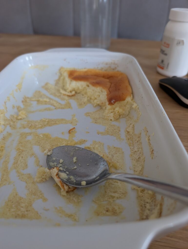 Die Auflaufform (mit Butter und Grieß ausgefettet) bis zur Hälfte füllen und anschließend auf ein mit Wasser gefülltes Backblech stellen (im Wasserbad garen). Ca. 25-30 Minuten garen bis die Oberfläche gebräunt ist.